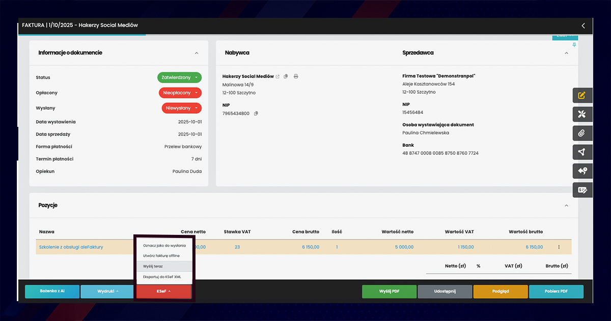 W mpFaktura wysyłka faktury do KSeF jest banalnie prosta. Po zakończeniu edycji dokumentu kliknij KSeF -> Wyślij teraz**, a system zajmie się resztą.