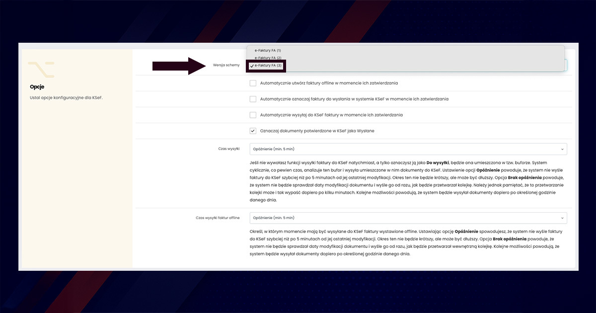 - W sekcji Ustawienia zaznacz opcję KSeF 2.0.